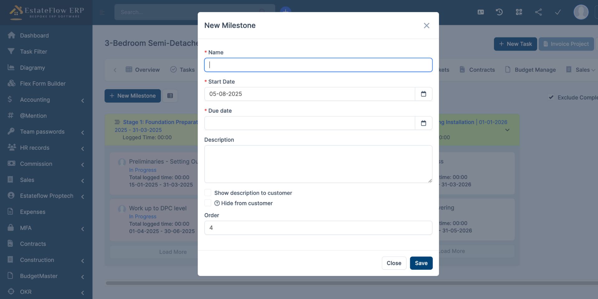 Milestones represent major phases or deliverables within a project. In real estate development projects, milestones often reflect stages such as Foundation Works, Superstructure, Roofing, Finishing, and Handover. Creating milestones ensures that tasks are aligned with key project phases.